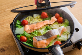 フライパンにオリーブ油を広げ、白菜、ミニトマト、にんにく、鮭を順にのせます。