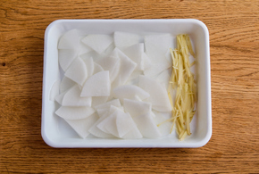 大根は薄いいちょう切りに、しょうがはせん切りにします。