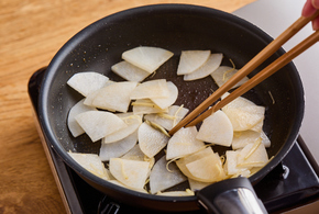 フライパンにごま油を中火で熱し、大根としょうがを入れて2分ほど炒めます。
