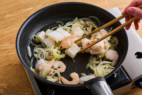フライパンにごま油を中火で熱し、玉ねぎを炒めます。透き通ってきたらシーフードミックスを凍ったまま加え、2分ほど炒めます。