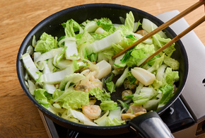 シーフードミックスが溶けてきたら、白菜を加え、しんなりとするまで2分ほど炒めます。