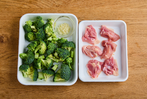 ブロッコリーは小房に分け、にんにくはみじん切りにします。鶏肉は食べやすい大きさに切り、塩を揉み込みます。
