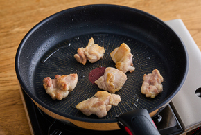 フッ素樹脂加工のフライパンに鶏肉の皮目を下に並べ、中火で3〜4分焼きます。