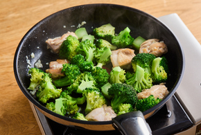 焼き色が付いたら裏返し、ブロッコリーとにんにくを加えます。香りが立ったら酒を回し入れ、蓋をして弱火で5〜7分蒸します。