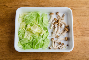 耐熱容器にスパゲッティを半分に折って入れます。ツナ水煮、キャベツ、しめじ、Aを加えます。