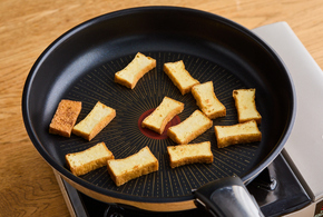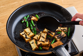 フッ素樹脂加工のフライパンに厚揚げを入れて中火で熱し、表面がカリッとするまで3分ほど焼きます。