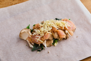 クッキングシートを広げ、真ん中にほうれん草、まいたけ、鶏ささ身の順に重ねてのせ、ピザ用チーズを散らします。
