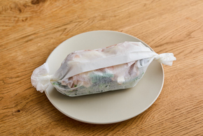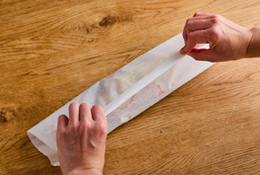 シートを手前側から具材を全て覆うようにかぶせ、奥側からも覆いかぶせます。重なる部分を2回ほど折り、両端をねじります。