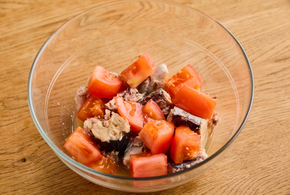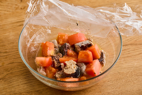 耐熱ボウルにさば水煮缶を汁ごと入れ、トマト、めんつゆを加えます。全体を軽くまぜ、ふんわりとラップをかけます。