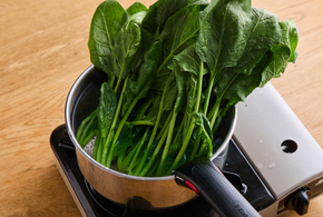 鍋に湯を沸かし、ほうれん草を入れて30秒ほどゆでます。流水にさらして粗熱を取り、水けを絞って3cm幅に切ります。