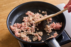 フライパンにごま油、赤とうがらしを中火で熱し、鶏ひき肉を炒めます。色が変わったら、ほうれん草を加えて2分ほど炒めます。