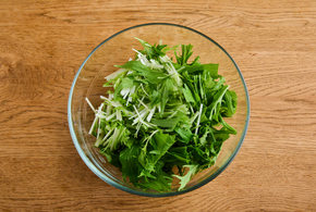 水菜は4cm幅に切ります。耐熱ボウルに入れてふんわりとラップをし、電子レンジ(600w)で2分加熱します。