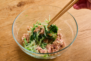 2にツナを油ごと、白ごま、にんにく、鶏がらスープの素を入れます。ツナの油が全体に行き渡るようによくあえたら完成です。
