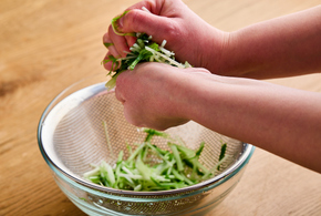 加熱後、水菜をさっと水にさらします。水けをきり、しっかりと絞ります。