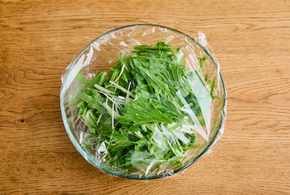 水菜は4cm長さに切ります。耐熱容器に入れてふんわりとラップをし、電子レンジ(600w)で3分ほど加熱します。