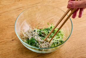 粗熱が取れたら水けをしっかりと絞ります。ちりめんじゃこ、酢、砂糖を加えてあえたら出来上がりです。