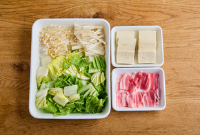 豆腐、白菜は食べやすい大きさに、えのきは半分の長さに切ります。豚肉は食べやすい大きさに切ります。