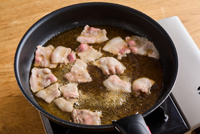 フライパンにAを入れて中火で熱します。煮立ったら豚肉を加え、色が変わるまで煮てアクを取り除きます。