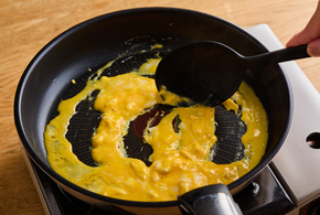 フッ素樹脂加工のフライパンに溶きほぐした卵を入れ、中火で熱します。大きくかき混ぜ、半熟状になったら一度取り出します。