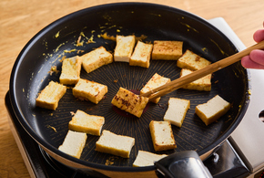 厚揚げを並べて焼きます。焼き色がついたらにら、きくらげ、混ぜ合わせたAを加えてとろみがつくまで炒めます。