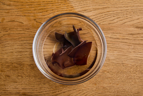 きくらげはぬるま湯につけて15分ほど置いて戻します。