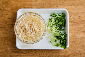 切り干し大根は水に15分ほどつけて戻し、水けをしっかりと切ります。貝割れ菜は根元を切り落とします。