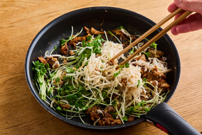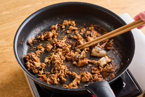 フッ素樹脂加工のフライパンにさばみそ煮を汁ごと入れ、ほぐしながら2分ほど炒めます。