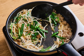 もやしを加え、にらはキッチンバサミで食べやすい長さに切りながら加えます。油が全体に回るまで、1分ほど炒め合わせます。