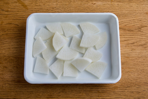 大根は1cm厚さのいちょう切りにします。耐熱容器に入れてふんわりとラップをし、電子レンジ(600w)で2分加熱します。