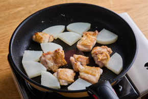 フライパンにサラダ油を中火で熱し、鶏肉を並べて3分焼きます。焼き色がついたら裏返し、大根を加え、さらに3分焼きます。