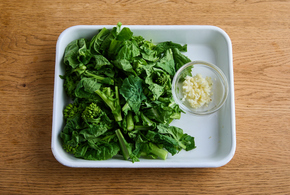 菜の花は根元を1cm切り落とし、3等分に切ります。にんにくはみじん切りにします。えびは酒、塩を振って5分ほどおきます。
