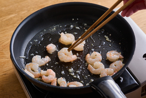 フライパンににんにくとごま油を入れて中火で熱し、香りが立ったら、えびを加えて炒めます。