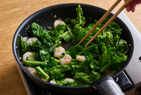えびの色が変わったら、菜の花を加え、2分炒めます。しんなりとしたら塩を振り、蓋をして弱火で2分蒸らします。