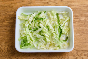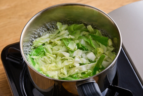 ゆで上がる1分前にキャベツを加え、一緒にゆでます。水けをしっかりときり、粗熱を取ります。