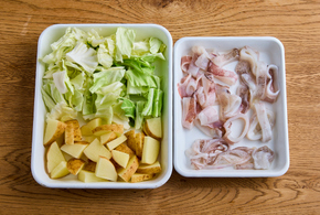 じゃがいもは1cm幅のいちょう切りに、キャベツは一口大にします。いかは胴体は輪切り、足は4cm長さに切ります。