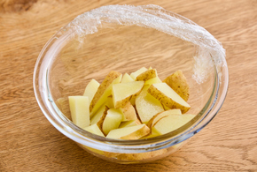 耐熱容器にじゃがいもを入れてふんわりとラップをし、電子レンジ(600w)で2分加熱します。
