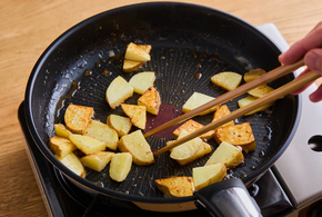 フライパンにバターを中火で熱し、じゃがいもを入れます。全体に焼き色がつくまで2分ほど炒めます。