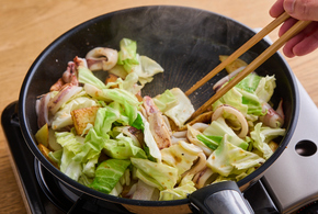 いか、キャベツ、Aを加えます。強めの中火にし、いかに火が通るまで3分ほど炒めて出来上がりです。