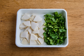 かぶはよく洗い、5mm厚さのいちょう切りにします。かぶの葉は1cm幅に切ります。