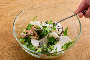 かぶを皮ごと使い、水々しさと食感を楽しめる一品。ツナのうま味と塩昆布のほどよい塩けが重なり、かぶの甘味を引き立てます。