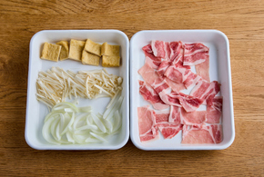 玉ねぎは1cm幅、えのきは3等分の長さに切ります。油揚げ、豚肉は食べやすい大きさに切り、豚肉に片栗粉をまぶします。