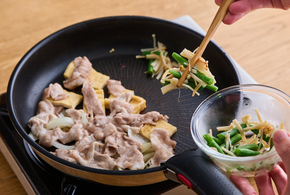 フライパンの半分に玉ねぎを敷いて、油揚げ、豚肉の順に重ねます。空いたところにいんげん、えのきを加えます。