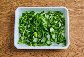 ピーマンは縦に半分に切り、横1cm幅に切ります。