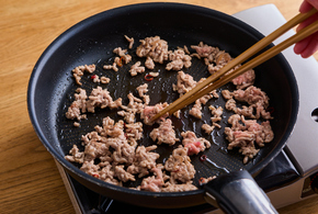 フッ素樹脂加工のフライパンにひき肉を入れ、中火で炒めます。脂が出てきたら赤とうがらしを加え、1分ほど炒めます。