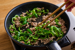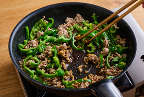 ひき肉の色がかわったらピーマンを加え、さらに2分ほど炒めます。