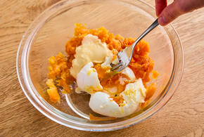 ボウルににんじんを入れてつぶします。ゆで卵、マヨネーズ、にんにくを加えてあえます。お好みで乾燥パセリを散らします。