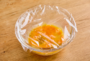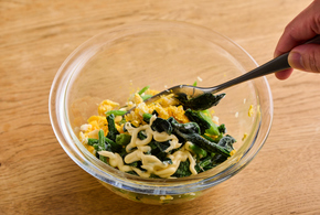 耐熱容器に卵を割り入れて軽く混ぜます。ふんわりとラップをして電子レンジ(600w)で2分加熱し、熱いうちにつぶします。