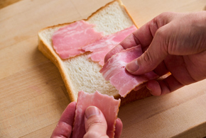 食パンの上にベーコンを大きめの一口大にちぎりながらのせ、2をのせます。