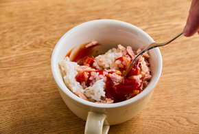 麦ご飯、ツナ、ケチャップを加えて混ぜます。ピザ用チーズをのせてラップをし、電子レンジ(600w)で2分加熱します。