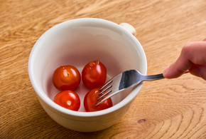 深めの耐熱用の器に、ミニトマトを入れてフォークで数か所穴をあけます。